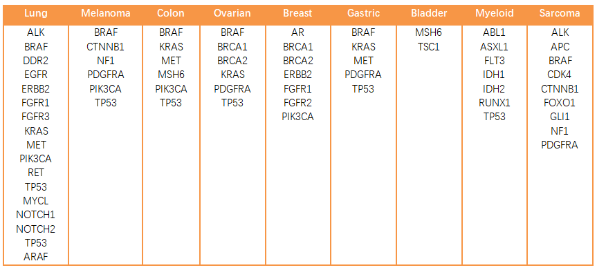 產(chǎn)品特性: 1. 樣本來源于臨床分離建立的細(xì)胞系,非常接近臨床病人的特性; 2. 泛癌種,涉及多種腫瘤相關(guān)的基因:肺癌、乳腺癌、結(jié)直腸癌、胰腺癌、血液腫瘤、胃癌等等,部分基因羅列如下: