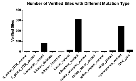 圖3. 不同突變頻率的位點(diǎn)數(shù)(經(jīng)過驗(yàn)證的位點(diǎn)) 6. 突變類型全覆蓋,有UTR區(qū)域,有內(nèi)含子,有外顯子,有錯(cuò)義突變,有同義突變,有供體變異等等;