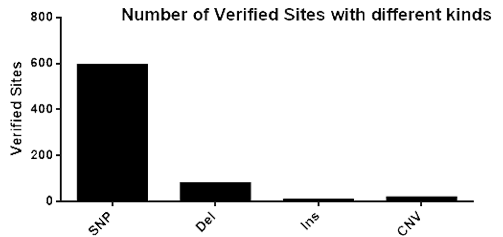 圖1. 在不同染色體編號(hào)上的位點(diǎn)數(shù)(經(jīng)過驗(yàn)證的位點(diǎn)) 4. 變異種類多:涉及SNP,deletion,insertion,CNV等等;