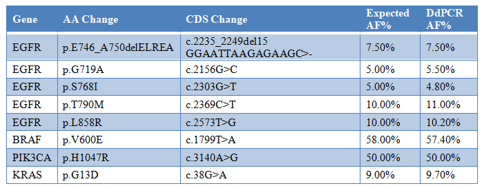 表2. 16個(gè)經(jīng)過1000x NGS-Panel試劑盒驗(yàn)證的位點(diǎn)信息 8.2 DdPCR驗(yàn)證8個(gè)位點(diǎn),Bio-Rad QX200和Bio-Rad原裝試劑