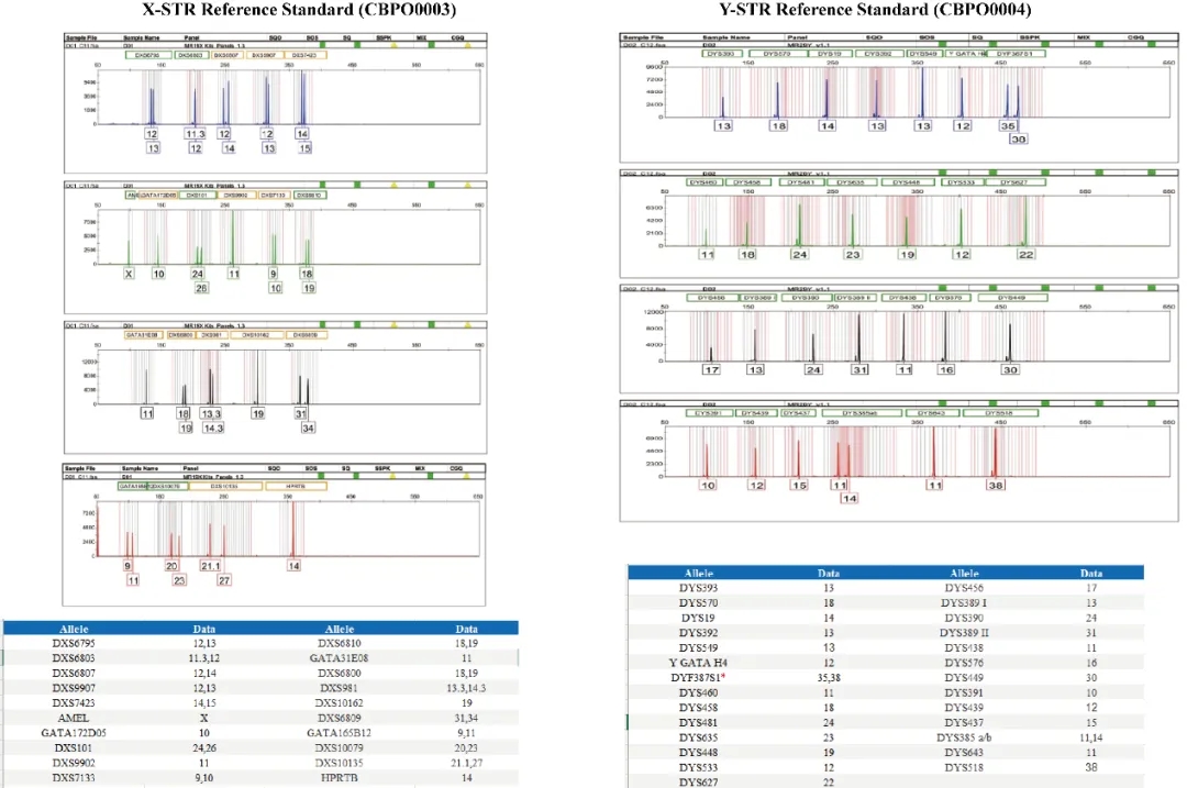X染色體標(biāo)準(zhǔn)品包含19個X-STR基因座和一個性別位點Amelogenin。Y染色體標(biāo)準(zhǔn)品包含22個低頻突變Y-STR基因座和7個高頻突變Y-STR基因座。低頻突變和高頻突變基因座相結(jié)合具有更高的個體識別能力,提供了強(qiáng)大的兼容性和排查能力。