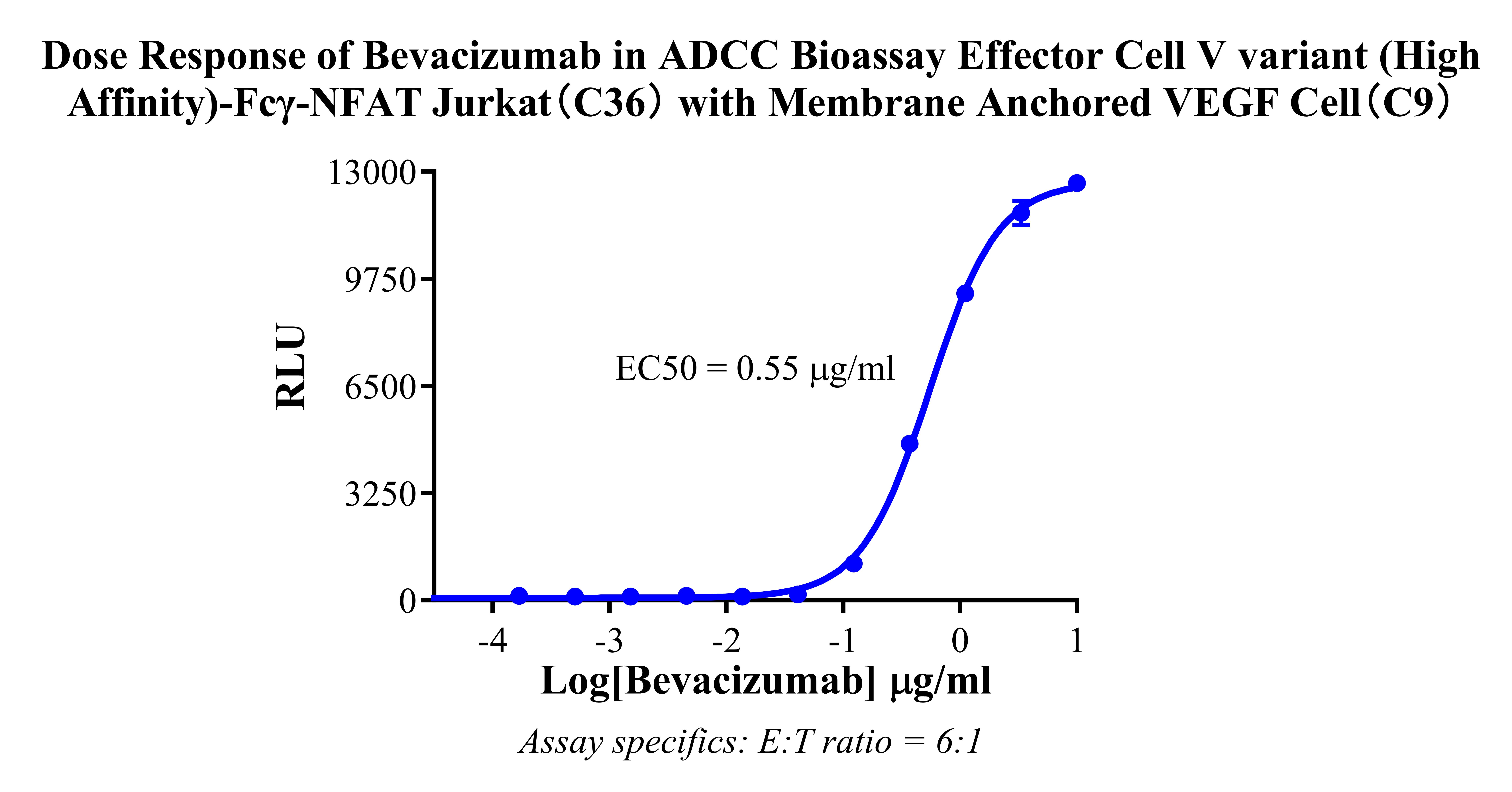 Figure 2. Dose Response of Bevacizumab in ADCC Bioassay Effector Cell V variant (High Affinity)-Fcγ-NFAT Jurkat(C36) with Membrane Anchored VEGF Cell(C9).