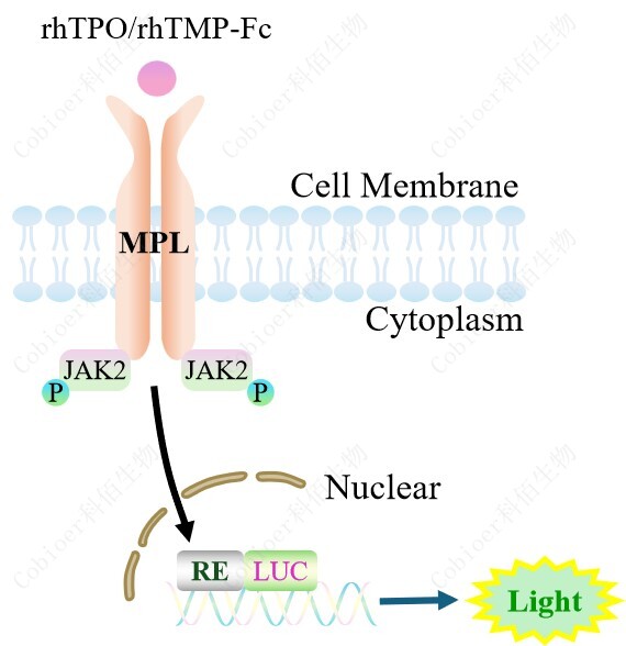 TPO Effector Reporter Cell 報告基因藥靶模型很好的模擬了體內(nèi) TPO 的信號轉(zhuǎn)導過程, 原理見下圖所示。