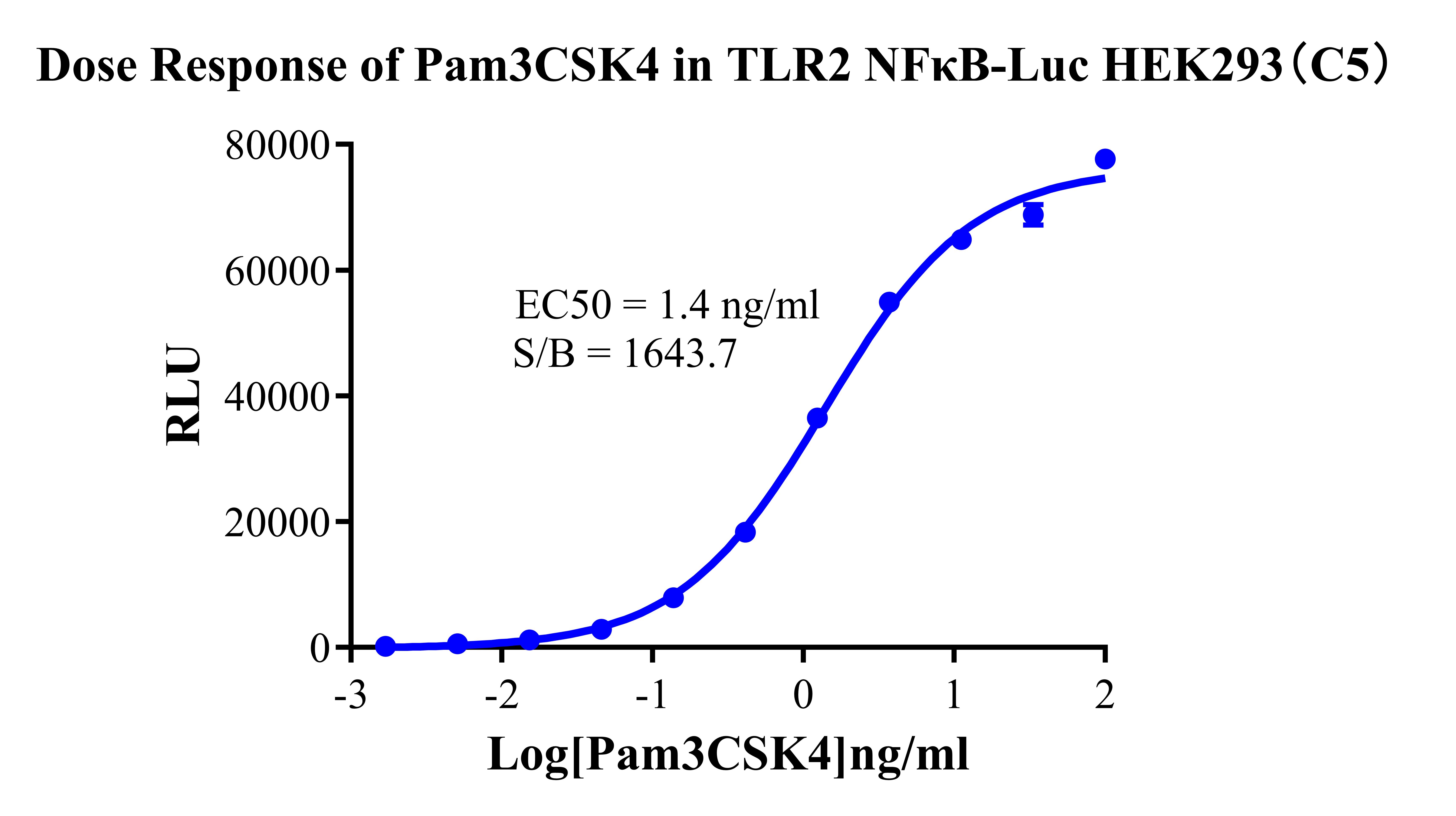 Figure 2.Detect Luciferase assay by Ultra Luciferase Detection Kit CBPH0001(we strongly suggest to purchase from Cobioer). Dose Response of Pam3CSK4 in TLR2 NFκB-Luc HEK293(C5).