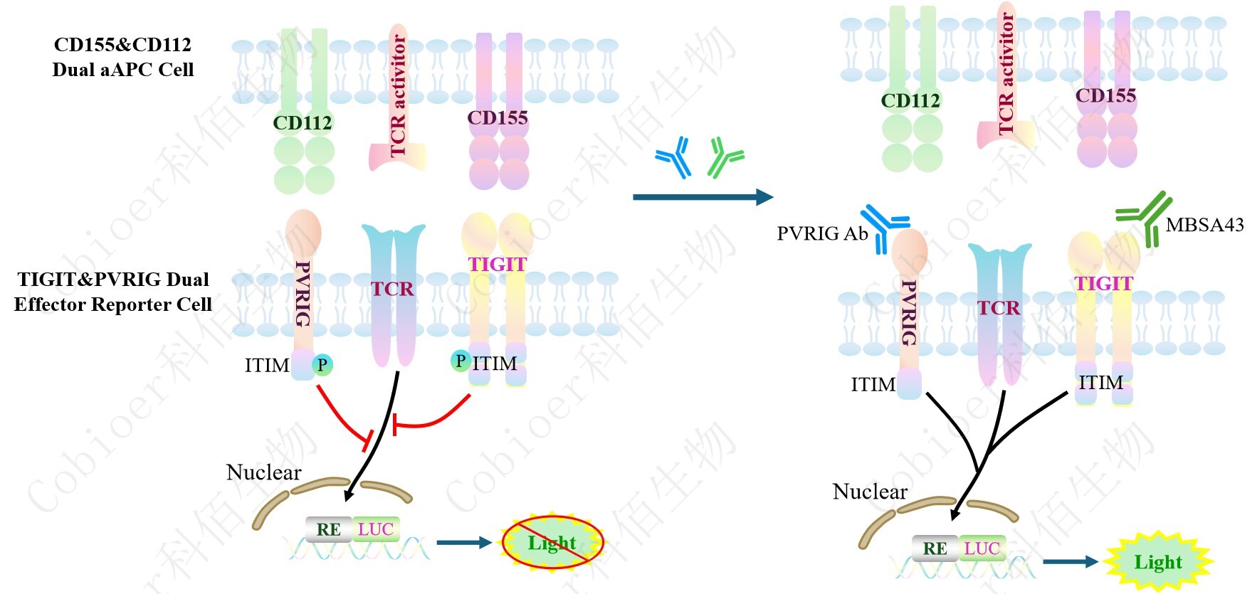 CD155&CD112 Dual aAPC Cell 作為 TIGIT&PVRIG Dual Effector Reporter Cell 的靶細(xì) 胞,很好的模擬了體內(nèi) TIGIT&PVRIG 的信號轉(zhuǎn)導(dǎo)過程,原理見下圖所示。