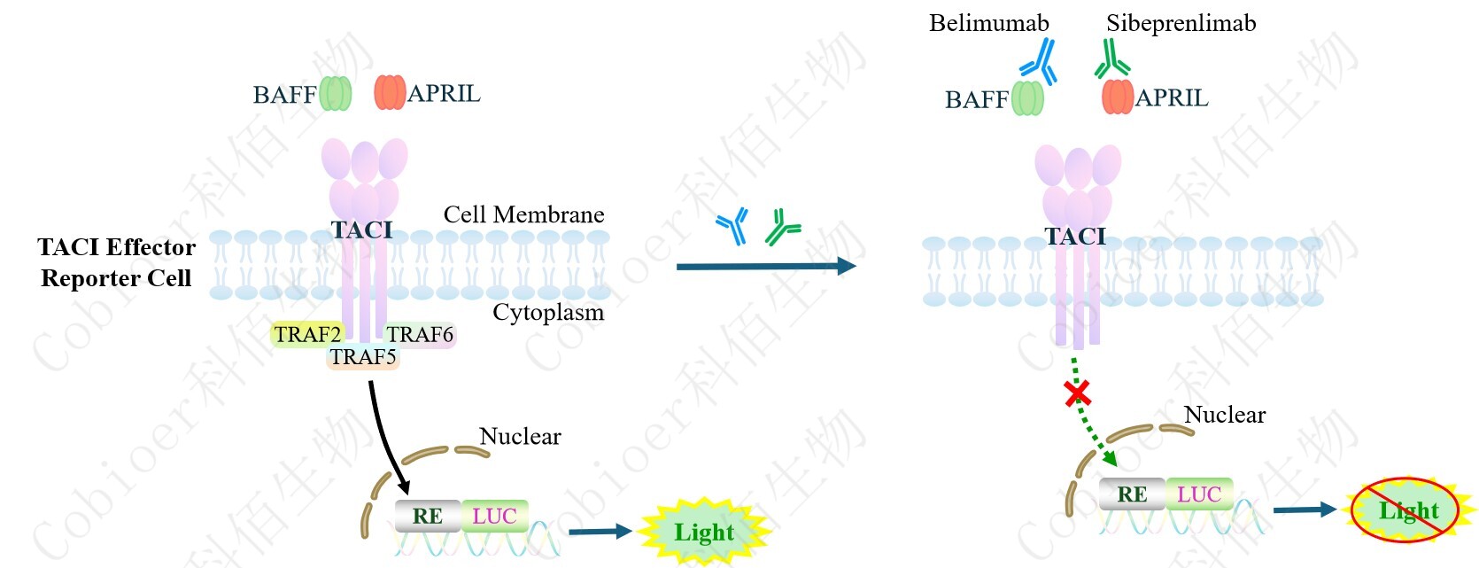 TACI Effector Reporter Cell 報(bào)告基因藥靶模型很好的模擬了體內(nèi) TACI 的信號轉(zhuǎn)導(dǎo)過程, 原理見下圖所示。