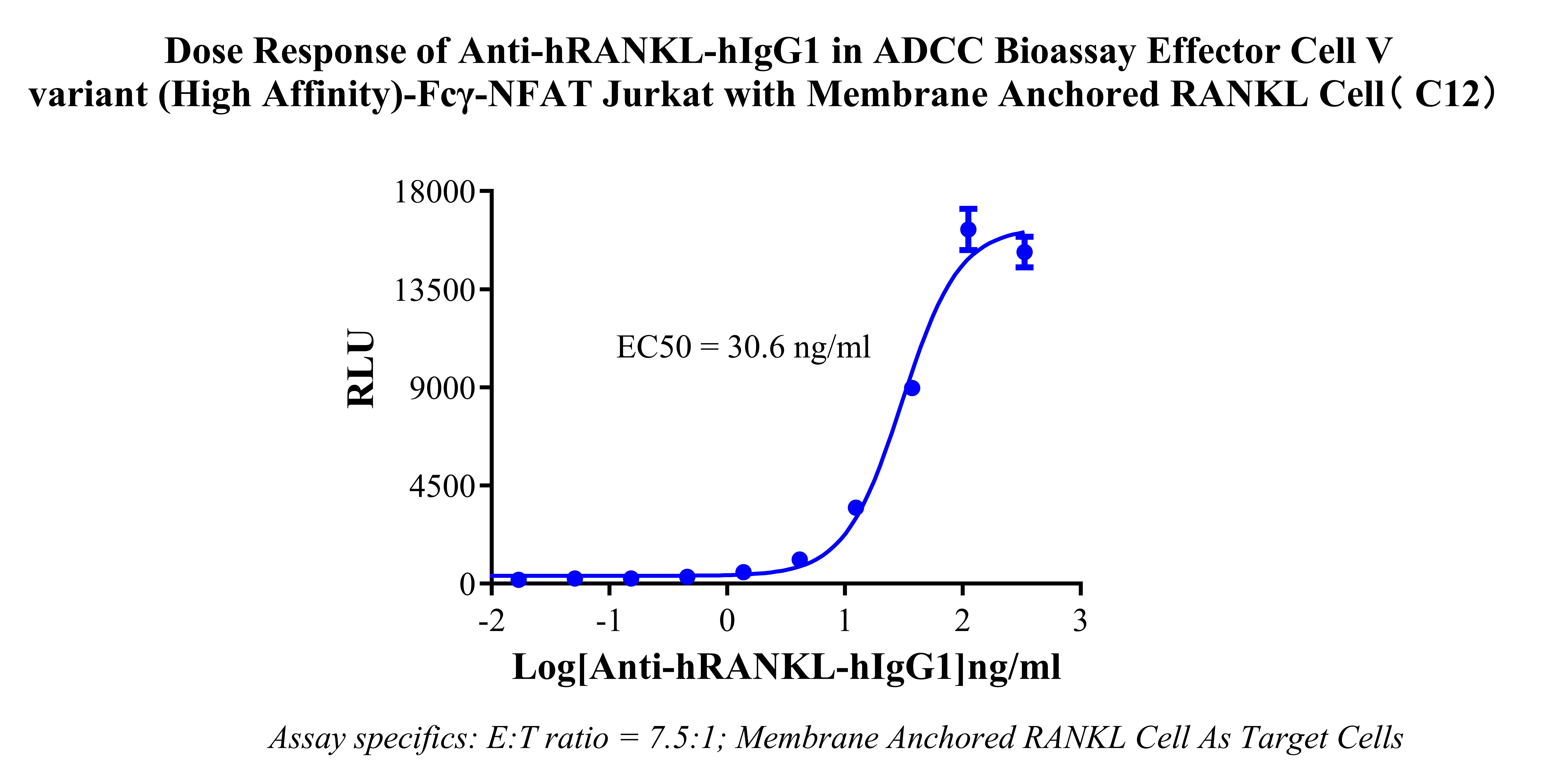 Figure 2. Dose response of Anti-hRANKL-hIgG1in ADCC Bioassay Effector Cell V variant (High Affinity)-Fcγ-NFAT Jurkat with Membrane Anchored RANKL Cell (C12).