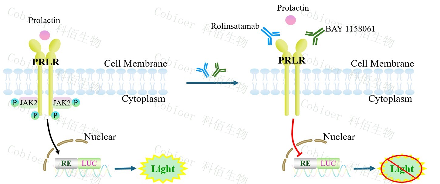 PRL Effector Reporter Cell 報(bào)告基因藥靶模型很好的模擬了體內(nèi) PRL 的信號(hào)轉(zhuǎn)導(dǎo)過程, 原理見下圖所示。