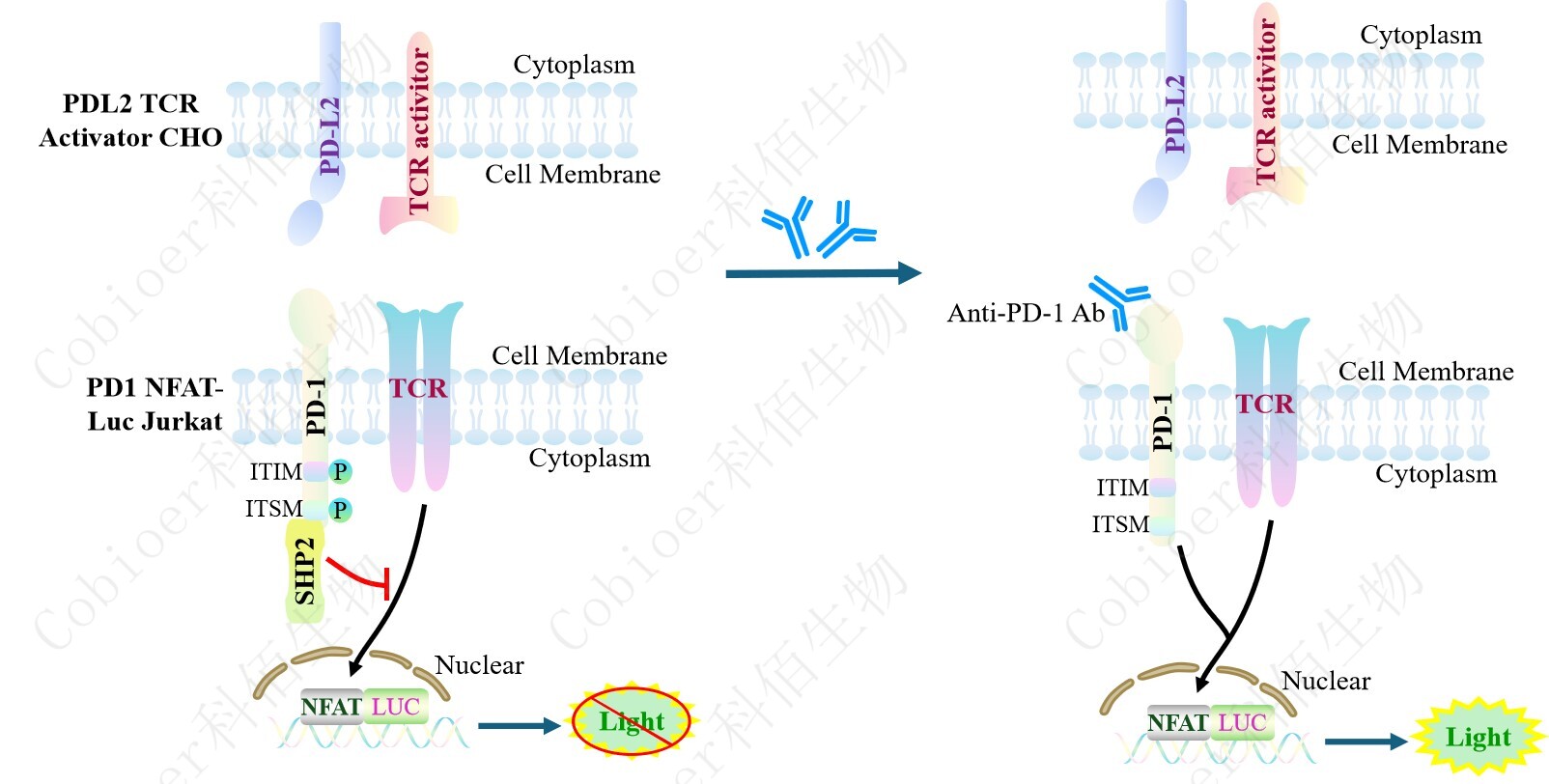 PDL2 TCR Activator CHO 細(xì)胞作為 PD1 NFAT-Luc Jurkat 細(xì)胞的靶細(xì)胞,很好的模擬了體內(nèi) PD1&PDL2 的信號轉(zhuǎn)導(dǎo)過程,原理見下圖所示。
