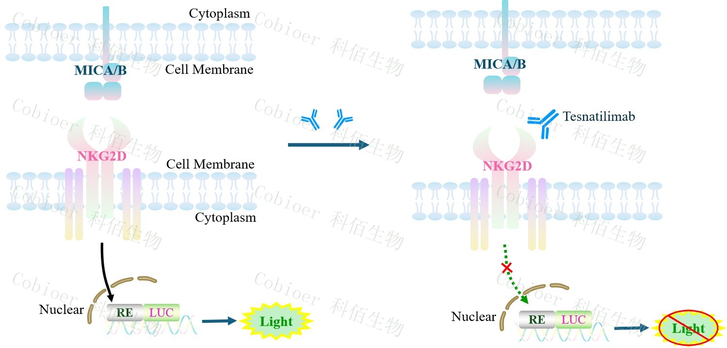 NKG2D Effector Reporter Cell 報(bào)告基因藥靶模型很好的模擬了體內(nèi) NKG2D 的信號(hào)轉(zhuǎn)導(dǎo)過程,原理見下圖所示。![]() Figure 1. NKG2D Effector Reporter Cell 細(xì)胞模型原理圖 |