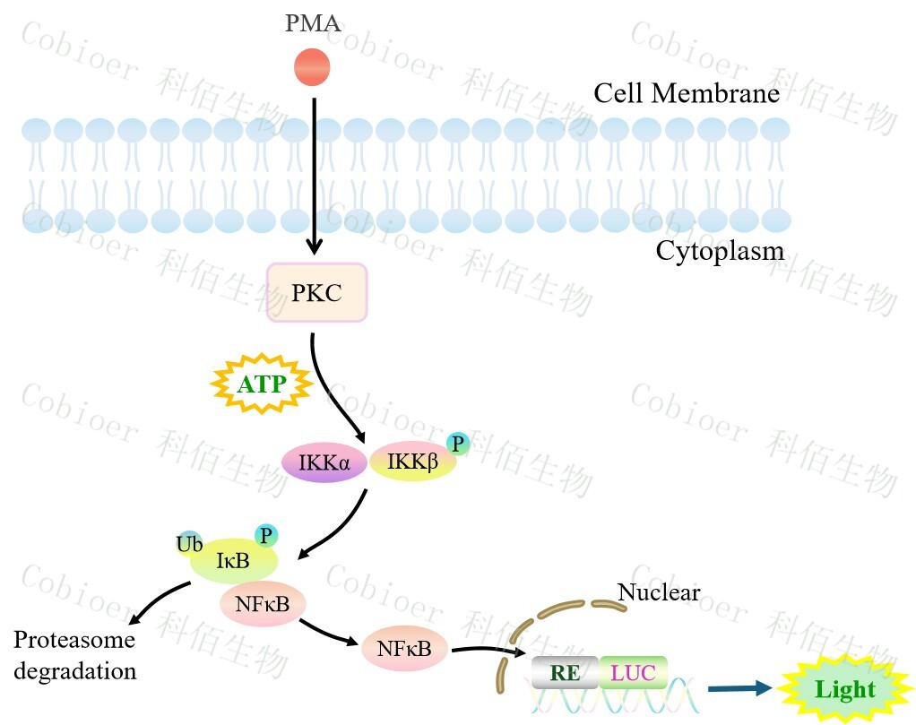 NFκB-Luc Jurkat 報告基因細(xì)胞是由 NFκB 調(diào)控并表達 Luc 熒光素酶報 告基因的 Jurkat細(xì)胞。PMA 是 DAG(二酯酰甘油)的類似物,可自由的通過細(xì)胞膜,直接 作用于細(xì)胞活化信號轉(zhuǎn)導(dǎo)通路上的 PKC,原理見下圖所示。![]() Figure 1. NFκB-Luc Jurkat 細(xì)胞模型原理圖