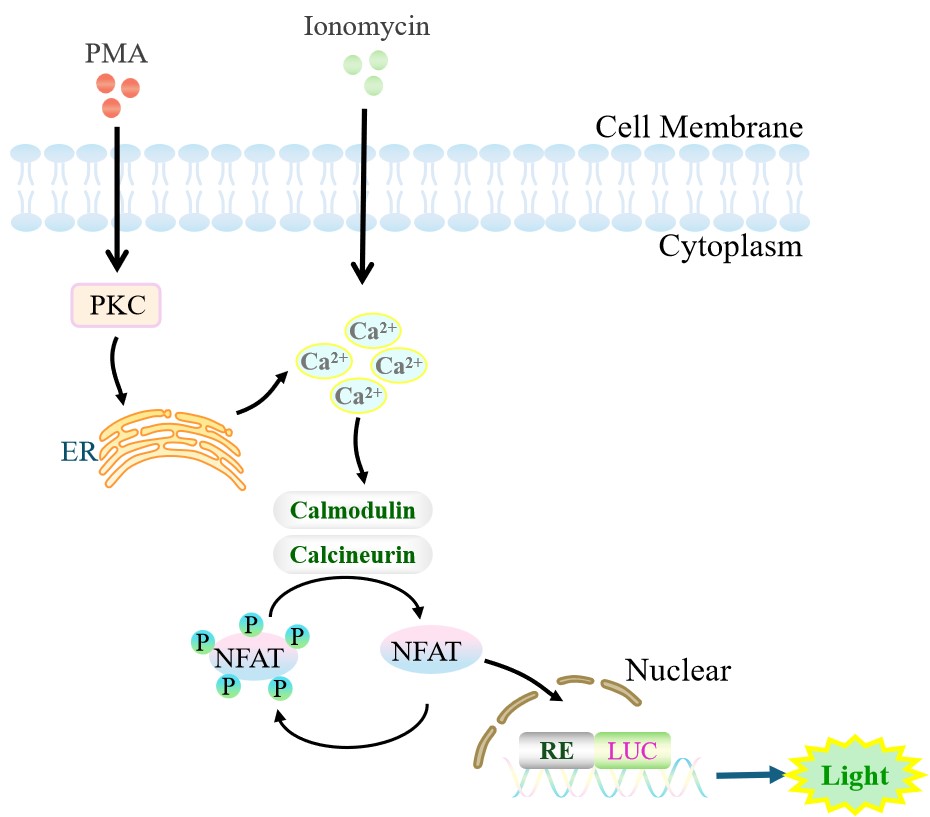 NFAT-Luc Jurkat 報(bào)告基因藥靶模型很好的模擬了體內(nèi) NFAT 的信號(hào)轉(zhuǎn)導(dǎo)過程,原理見下圖所示。
