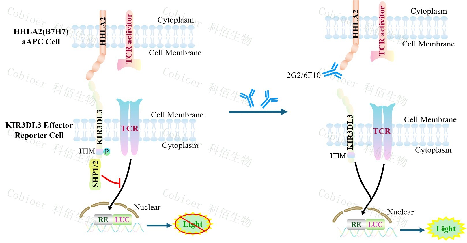 KIR3DL3 Effector Reporter Cell 報(bào)告基因藥靶模型很好的模擬了體內(nèi) KIR3DL3 的信號(hào) 轉(zhuǎn)導(dǎo)過程,原理見下圖所示。