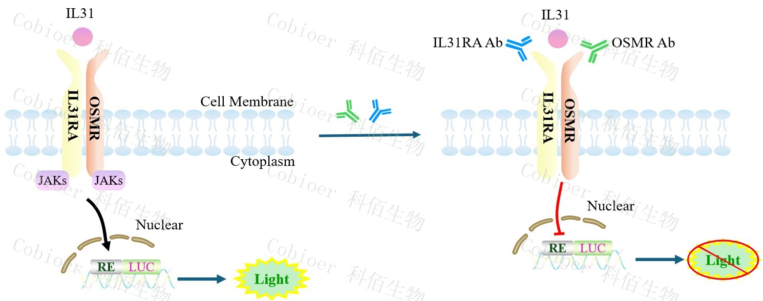 IL31 Effector Reporter報(bào)告基因藥靶模型很好的模擬了體內(nèi) IL31的信號(hào)轉(zhuǎn)導(dǎo)過(guò)程,原理見(jiàn)下圖所示。![]() Figure 1. IL31 Effector Reporter Cell 細(xì)胞模型原理圖