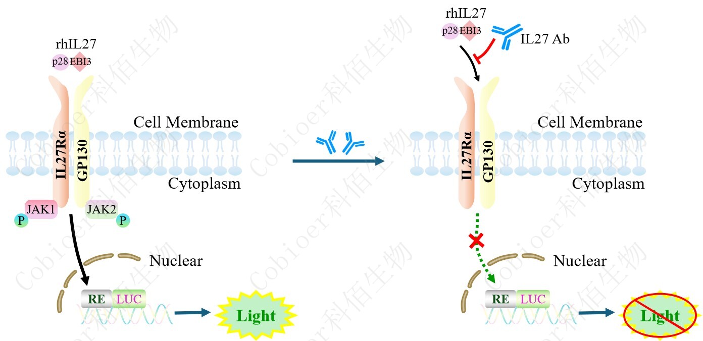 IL27 Effector Reporter Cell 報(bào)告基因藥靶模型很好的模擬了體內(nèi) IL27 的信號(hào)轉(zhuǎn)導(dǎo)過(guò)程, 原理見(jiàn)下圖所示。