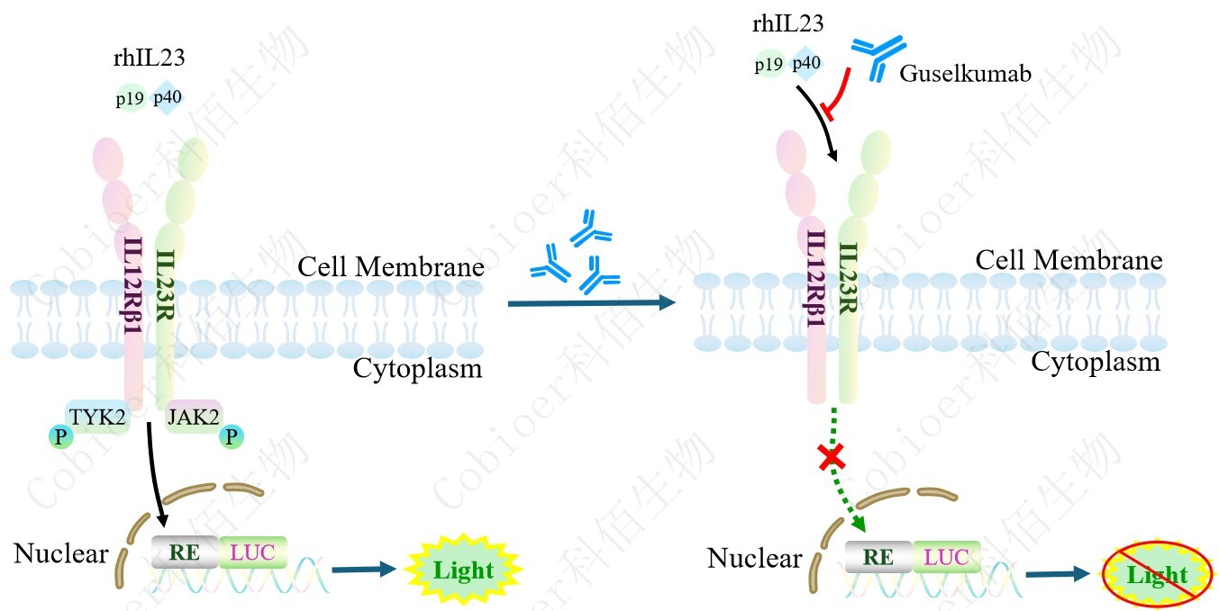 IL23 Effector Reporter Cell 報告基因藥靶模型很好的模擬了體內(nèi) IL23 的信號轉(zhuǎn)導(dǎo)過程, 原理見下圖所示。