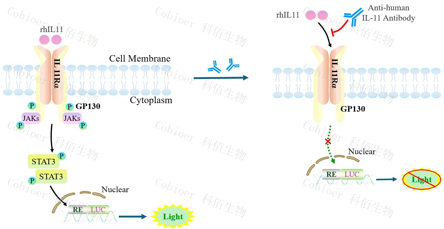 IL11 Effector Reporter Cell 報(bào)告基因藥靶模型很好的模擬了體內(nèi) IL11 的信號轉(zhuǎn)導(dǎo)過程, 原理見下圖所示。![]() Figure 1. IL11 Effector Reporter Cell 細(xì)胞模型原理圖 |