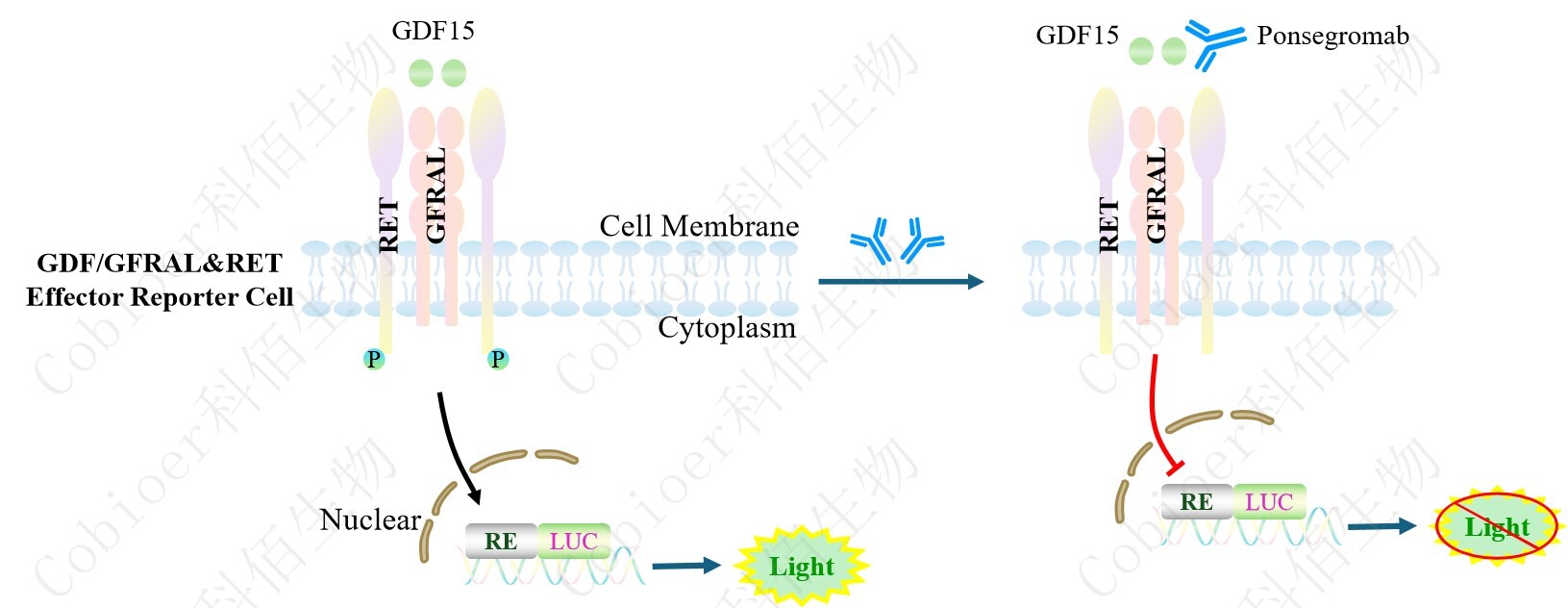 GDF/GFRAL&RET Effector Reporter Cell 報(bào)告基因藥靶模型很好的模擬了體內(nèi) GDF 的 信號轉(zhuǎn)導(dǎo)過程,原理見下圖所示。![]() Figure 1. GDF/GFRAL&RET Effector Reporter Cell 模型原理圖 |