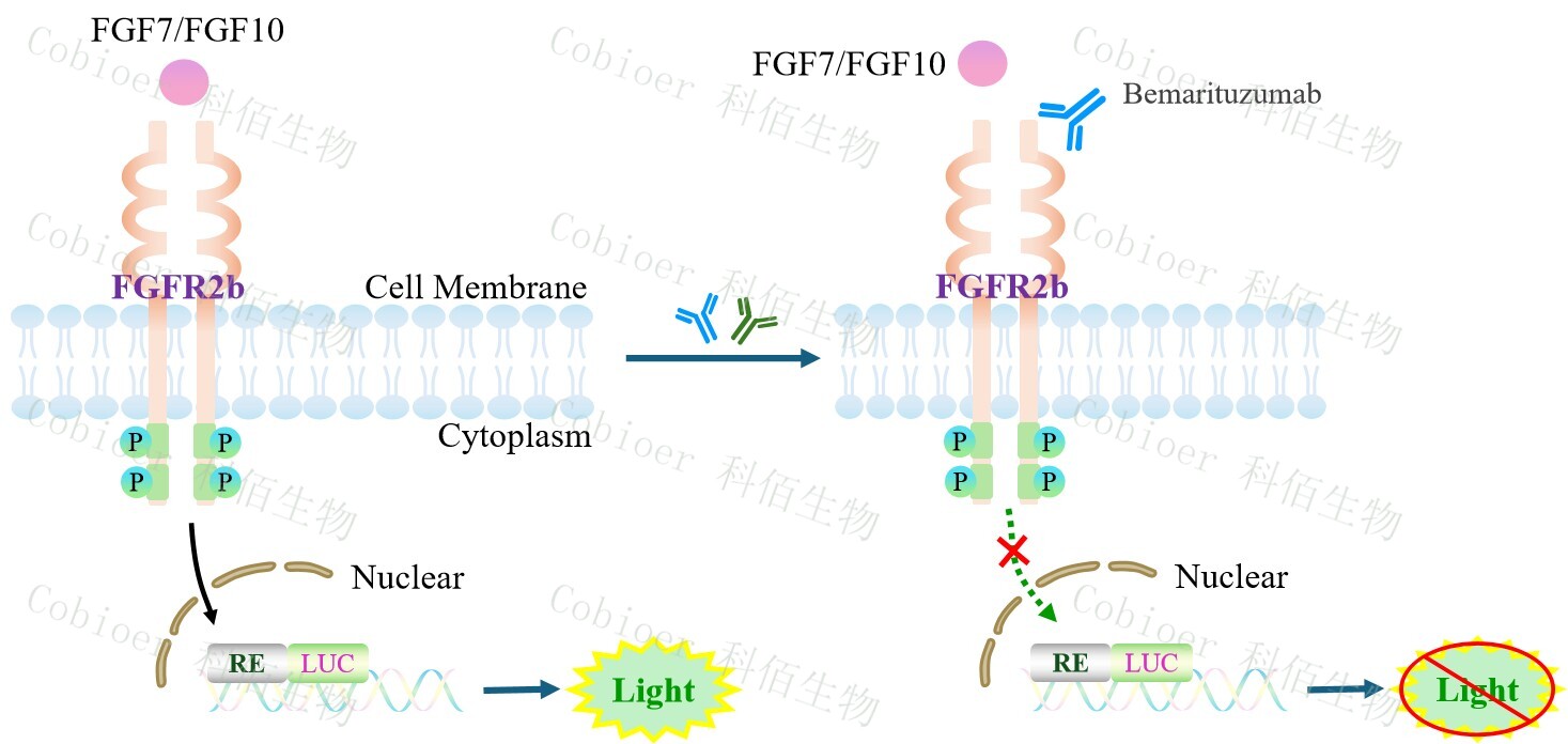 FGFR2b Effector Reporter Cell 報(bào)告基因藥靶模型很好的模擬了體內(nèi) FGFR2b 的信號(hào)轉(zhuǎn) 導(dǎo)過程,原理見圖 所示。![]() Figure 1. FGFR2b Effector Reporter Cell 細(xì)胞模型原理圖 |