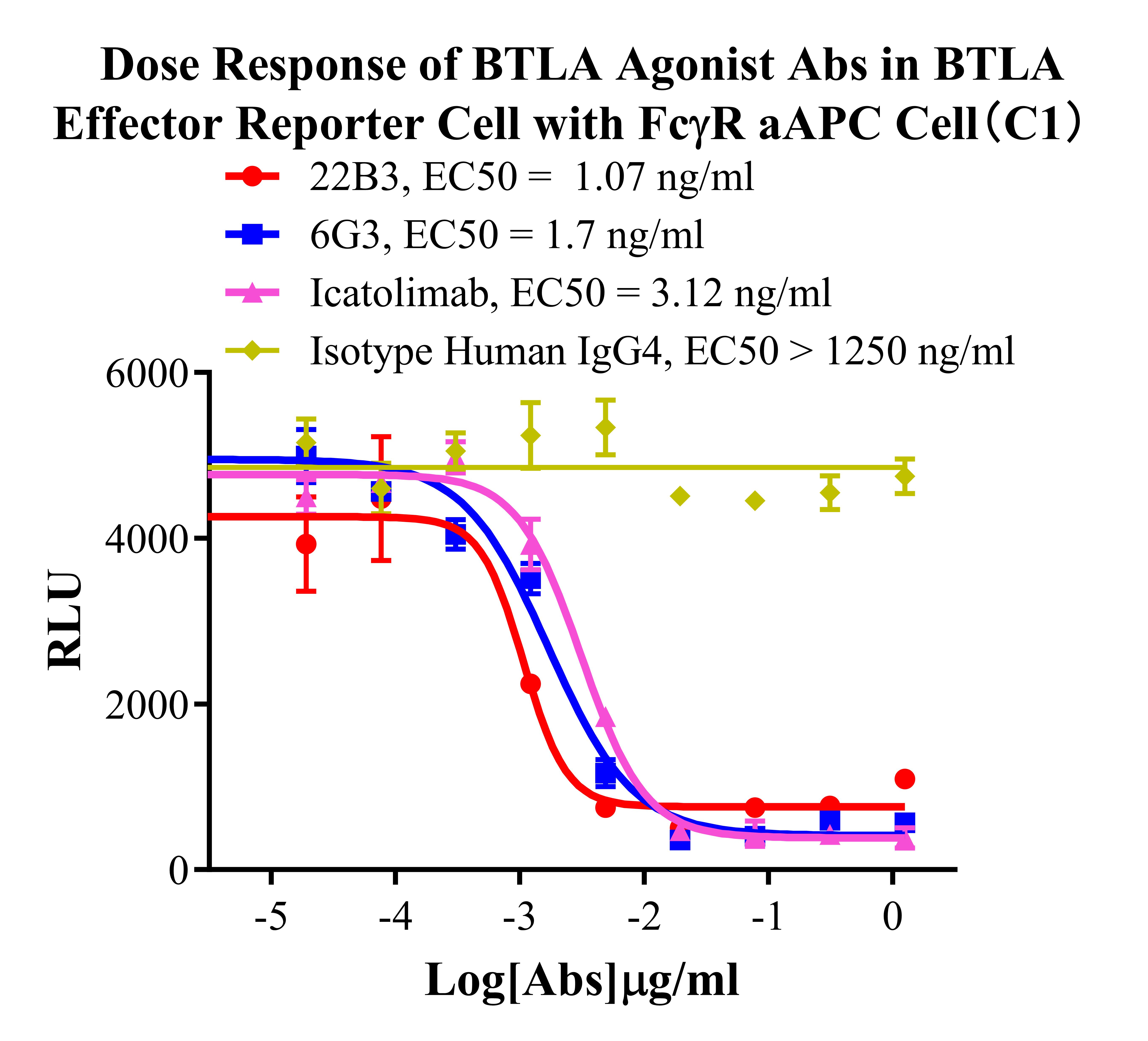 Figure 4. Dose Response of BTLA Agonist Abs in BTLA Effector Reporter Cell with FCγR aAPC Cell(C1). |