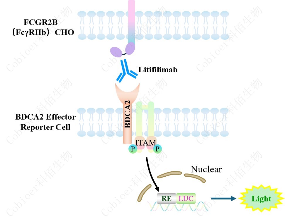 BDCA2 Effector Reporter 報告基因藥靶模型很好的模擬了體內(nèi) BDCA2 的信號轉(zhuǎn)導(dǎo)過程, 原理見下圖 所示。