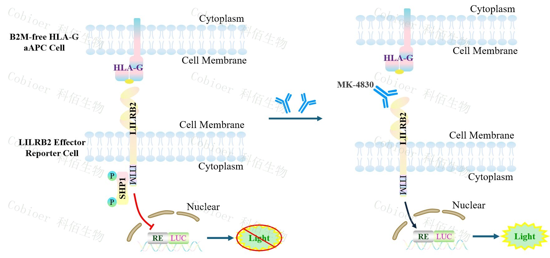 B2M-free HLA-G aAPC Cell 作為 LILRB2 Effector Reporter Cell 的靶細(xì)胞,很好的模擬 了體內(nèi) LILRB2 的信號轉(zhuǎn)導(dǎo)過程,原理見下圖所示。![]() Figure 1. B2M-free HLA-G aAPC Cell 模型原理圖 |