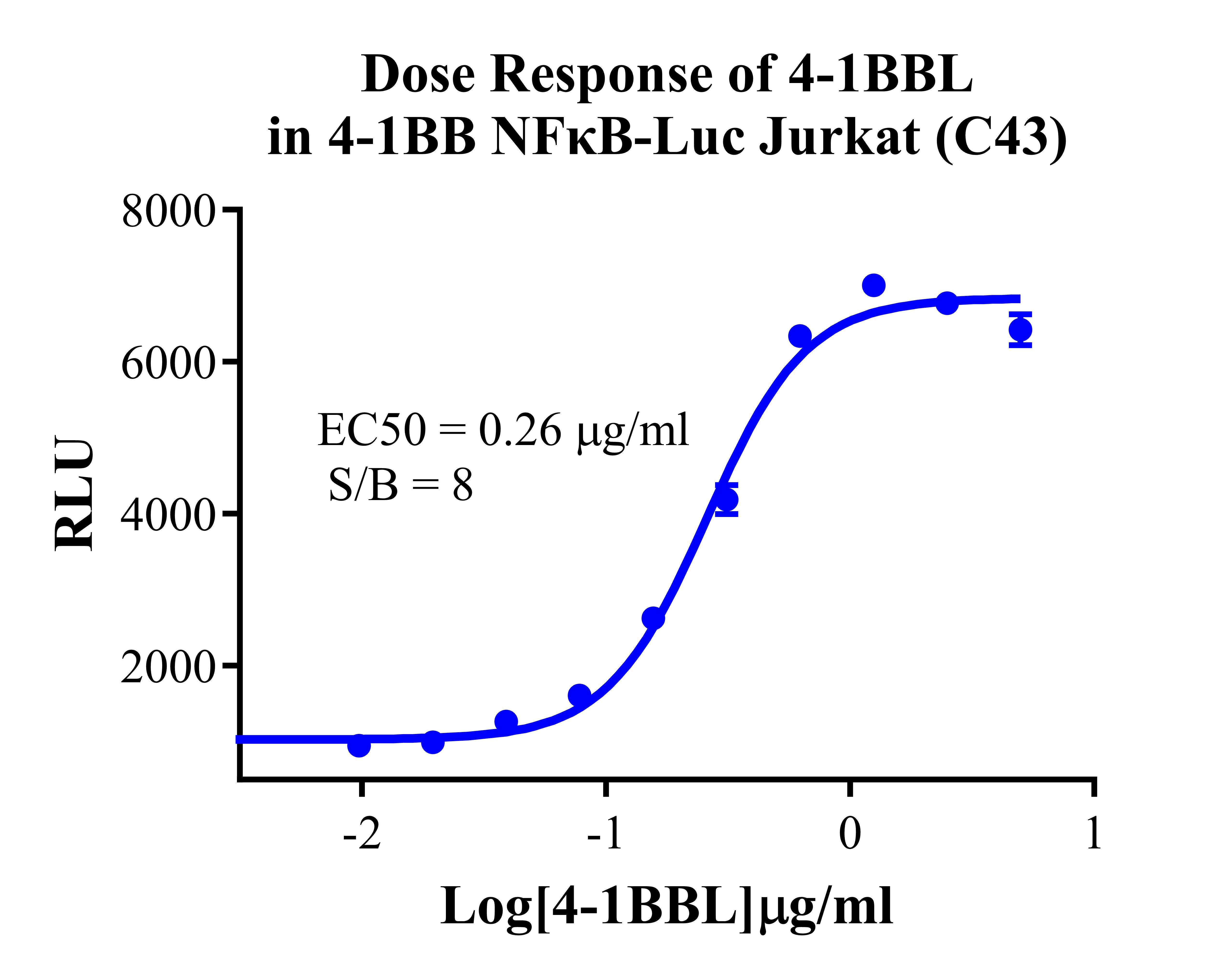 Figure 3. Detect Luciferase assay by Ultra Luciferase Detection Kit CBPH0001(we strongly suggest to purchase from Cobioer). Dose Response of 4-1BBL in 4-1BB NFκB-Luc Jurkat (C43).