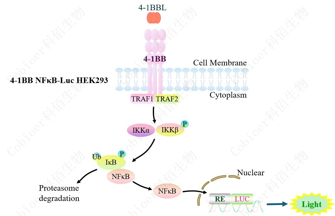 4-1BB NFκB-Luc HEK293 報(bào)告基因藥靶模型很好的模擬了體內(nèi) 4-1BB 的信號(hào)轉(zhuǎn)導(dǎo)過程, 原理見下圖所示。