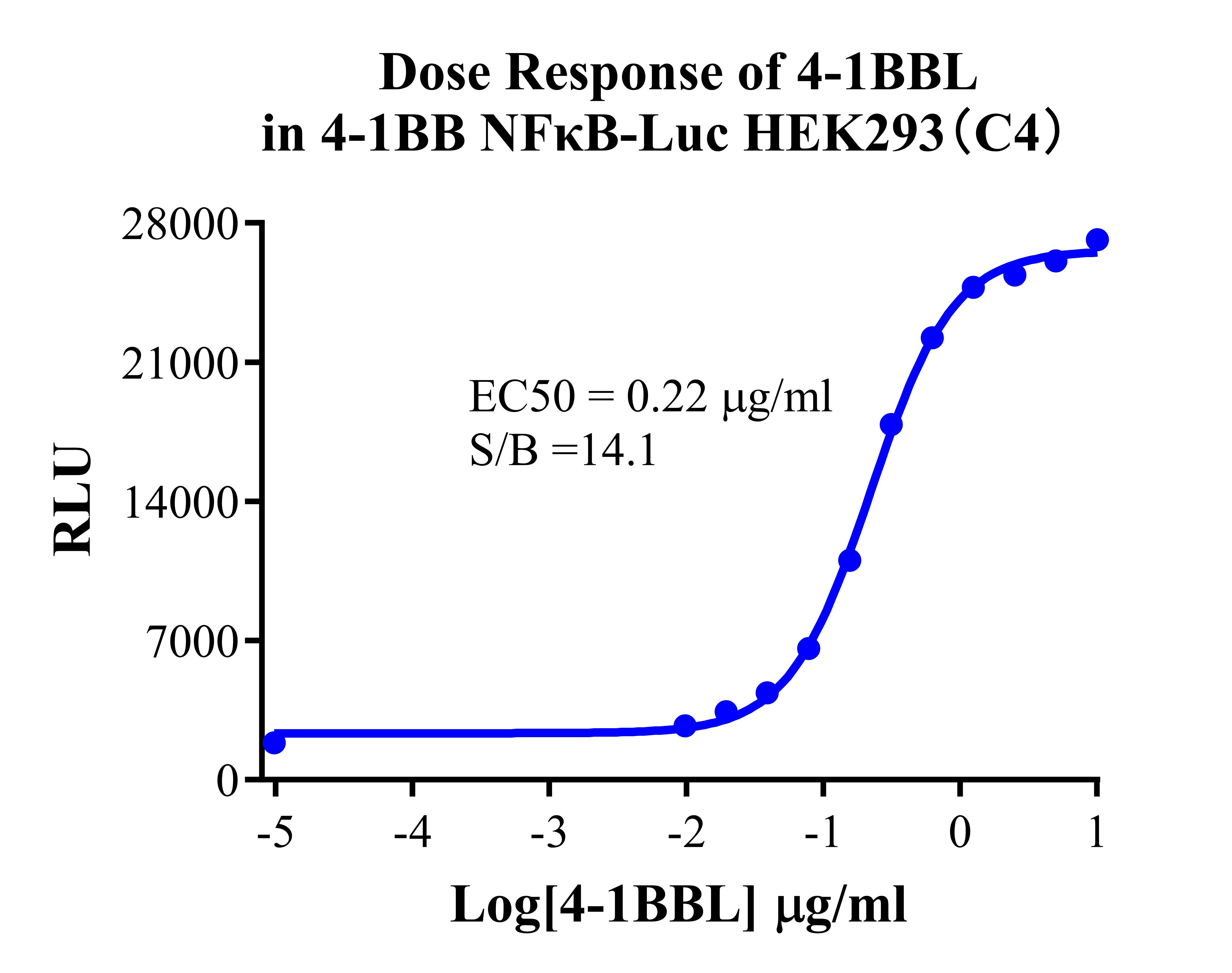 Figure 3. Detect Luciferase assay by Ultra Luciferase Detection Kit CBPH0001(we strongly suggest to purchase from Cobioer). Dose Response of 4-1BBL in 4-1BB NF-κB-Luc HEK293(C4).