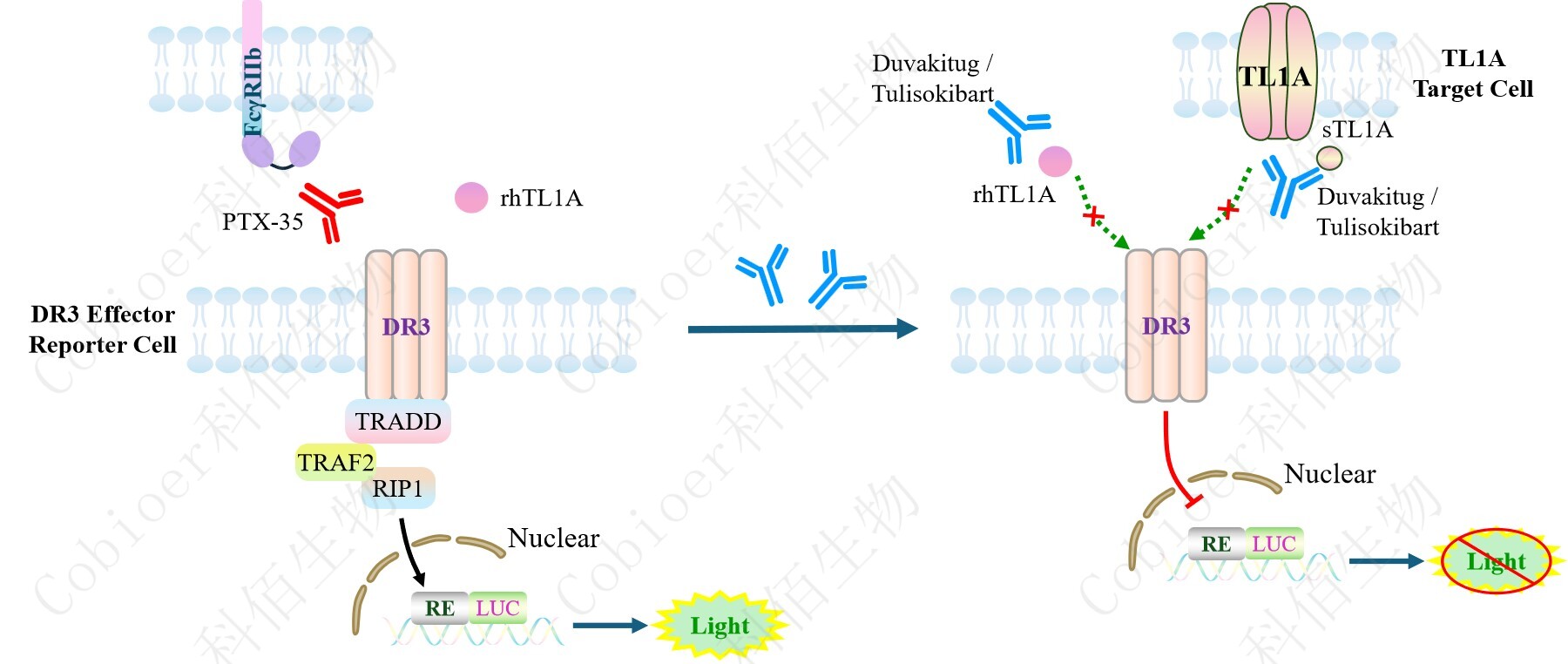 DR3 Effector Reporter 報(bào)告基因藥靶模型很好的模擬了體內(nèi) DR3 的信號(hào)轉(zhuǎn)導(dǎo)過程,原理見下圖所示。
