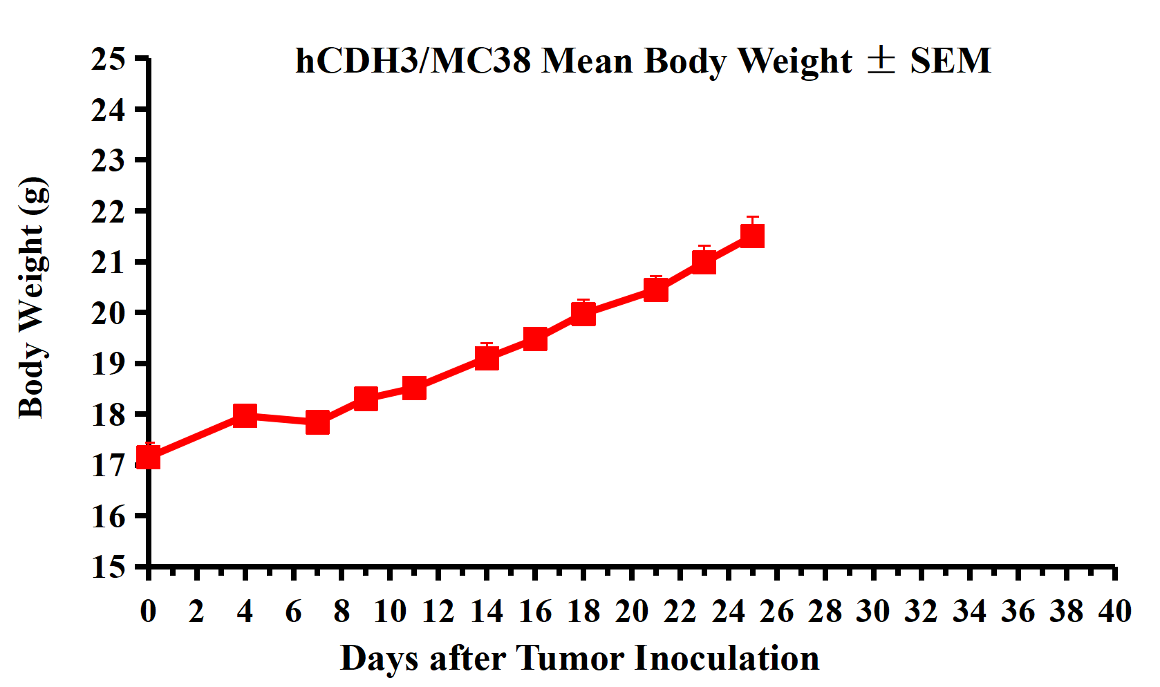 Figure 2. hCDH3/MC38 Mean Body Weight ± SEM.