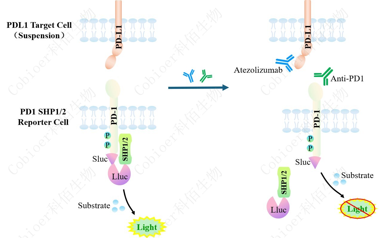 PDL1 Target Cell(Suspension)作為 PD1 SHP1 Reporter Cell 和 PD1 SHP2 Reporter Cell 的靶細(xì)胞,藥靶模型很好的模擬了體內(nèi) PD1&SHP1/SHP2 的信號(hào)轉(zhuǎn)導(dǎo)過(guò)程,原理見(jiàn)下圖所 示。