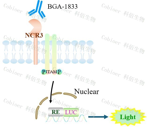 NCR3(NKp30) Effector Reporter 報(bào)告基因藥靶模型很好的模擬了體內(nèi) NKp30 的信號(hào) 轉(zhuǎn)導(dǎo)過(guò)程,原理見(jiàn)下圖所示。![]() Figure 1. NCR3(NKp30) Effector Reporter 細(xì)胞模型原理圖 |
