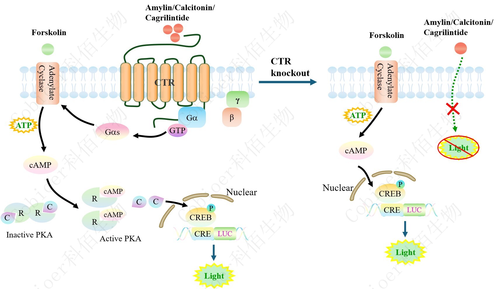 CTR-KO CRE-Luc HEK293 藥靶模型細(xì)胞可以用于 CTR 激動(dòng)劑的選擇性檢測(cè)評(píng)價(jià),以 確定候選激動(dòng)劑是否為 CTR 的特異性激動(dòng)劑,原理見(jiàn)下圖所示。