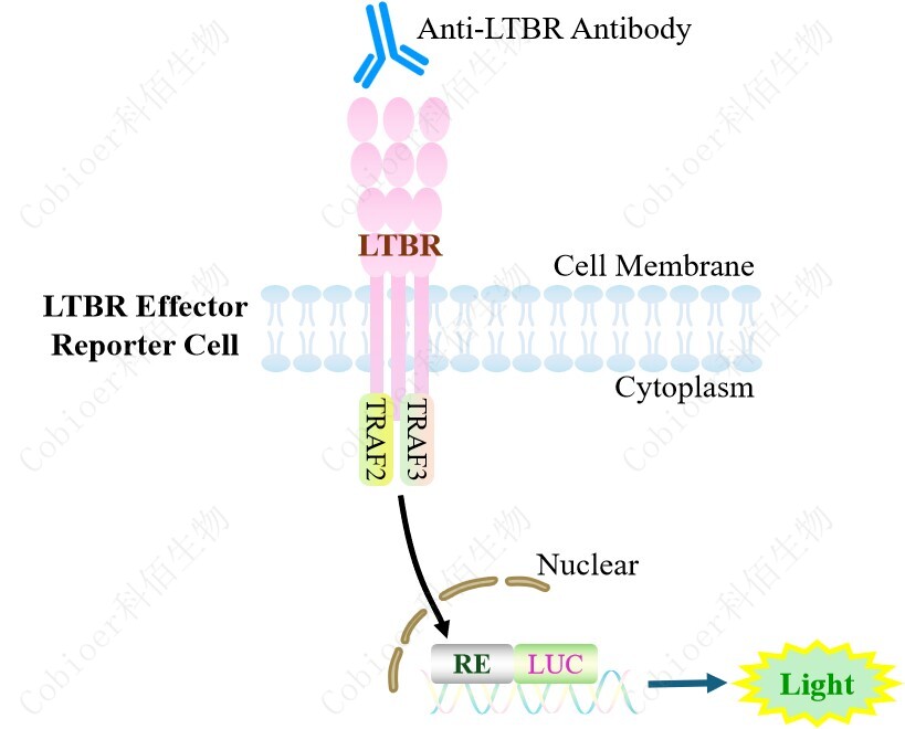 LTBR Effector Reporter Cell 報告基因藥靶模型很好的模擬了體內(nèi) LTBR 的信號轉(zhuǎn)導(dǎo)過 程, 原理見下圖所示。
