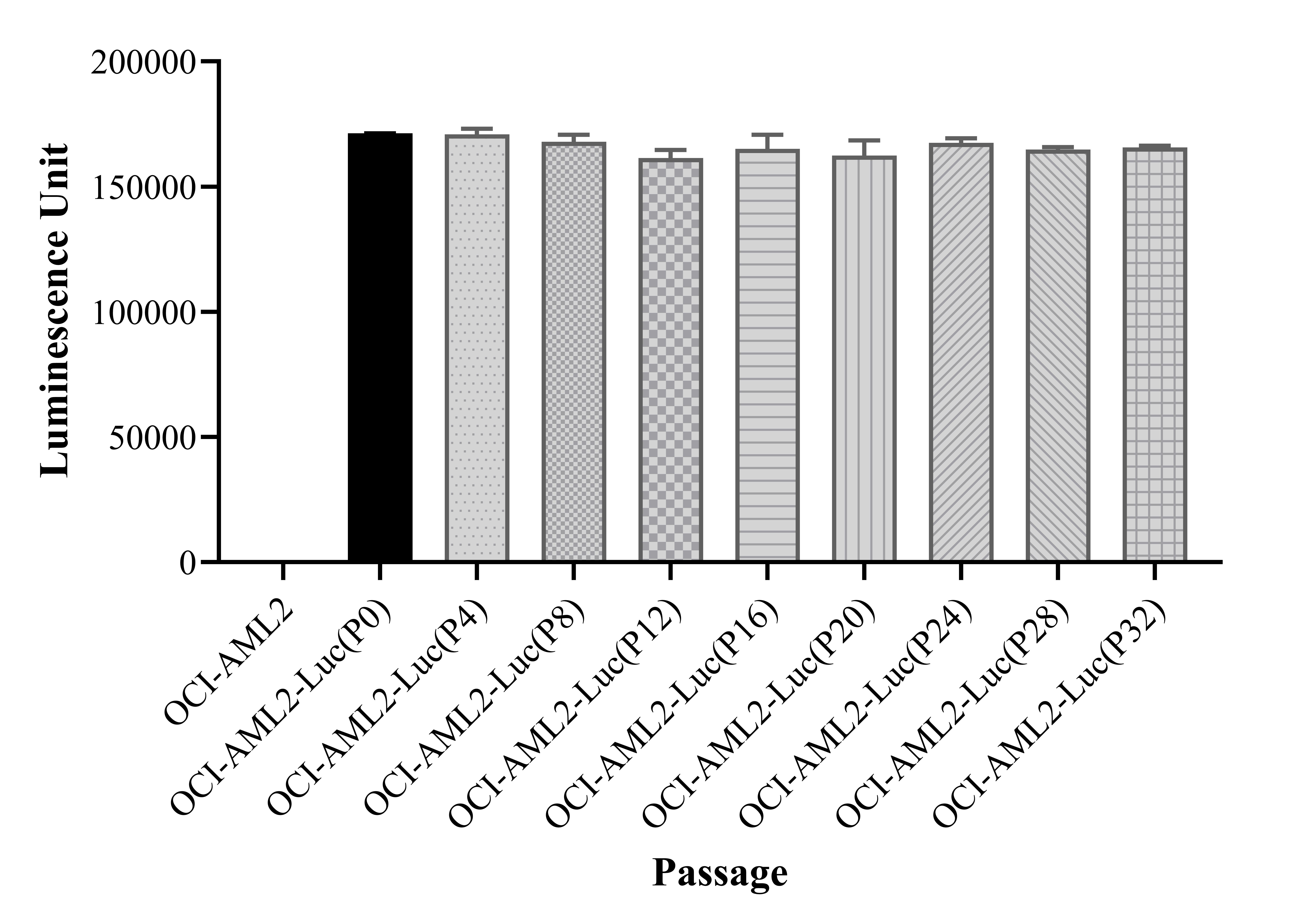 Figure 1. Stablity test results. OCI-AML2-Luc showed at least 32 passage stability with similar luminescence unit.
