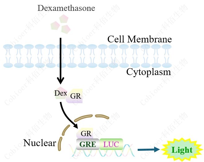 GRE-Luc A549 報告基因細胞,是由 GRE 調控并表達 Luc 熒光素酶報告 基 因的 A549 細 胞。 Dexamethasone (Hexadecadrol, 地 塞米 松)是 糖皮質激素受體 (Glucocorticoid Receptor)激動劑、凋亡誘導劑,原理見下圖所示。