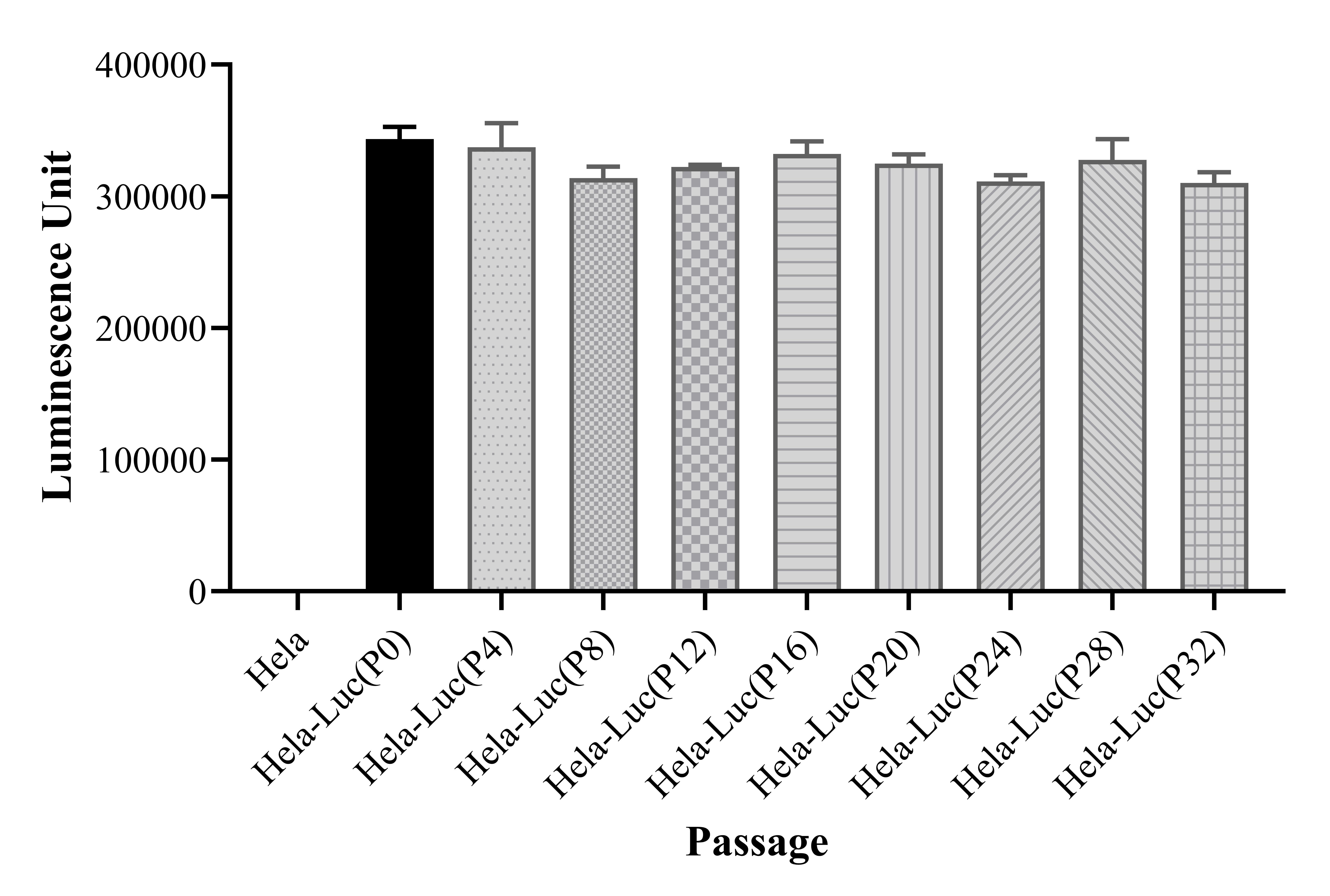 Figure 1. Stablity test results. Hela-Luc showed at least 32 passage stability with similar luminescence unit.