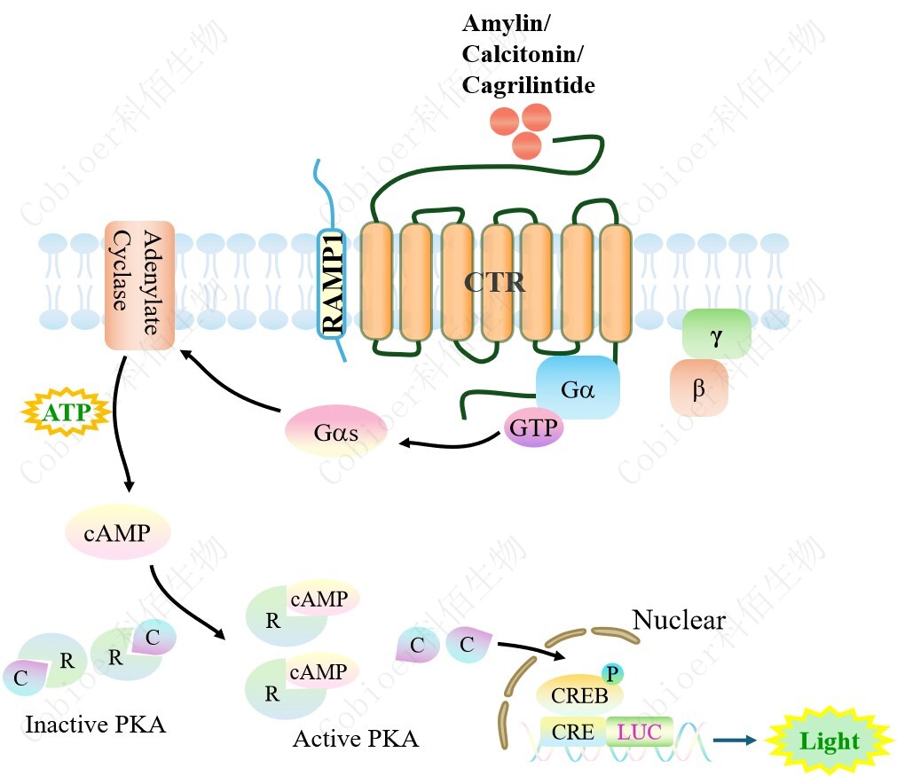 CTR&RAMP1 CRE-Luc HEK293 報(bào)告基因藥靶模型很好的模擬了體內(nèi) CTR&RAMP1 的信號(hào)轉(zhuǎn)導(dǎo)過程,原理見下圖所示。