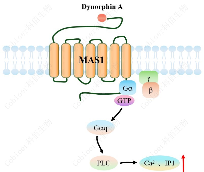 MAS1 可以通過 Gq 蛋白的信號通路,調(diào)控 IP1 的升高。MAS1 與配體結(jié)合,導(dǎo)致 Gαq 亞基的激活,觸發(fā) PLC-γ,從而產(chǎn)生兩個第二信使:IP3 和 DAG,它們參與細(xì)胞內(nèi)鈣動員。 由于 IP3 在代謝上不穩(wěn)定,因此測量通路激活的替代標(biāo)志物 IP1 作為檢測標(biāo)準(zhǔn)。