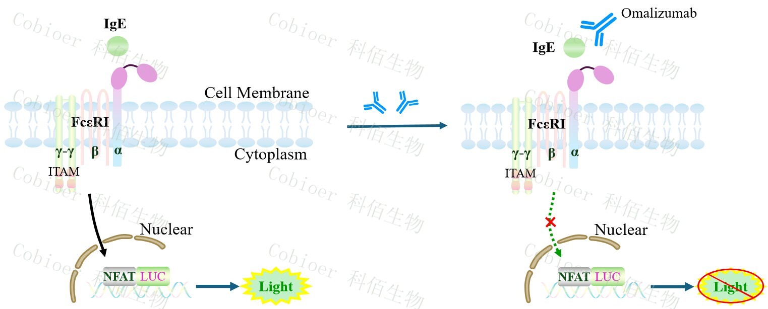 FcεRI Effector Reporter Cell 藥靶模型很好的模擬了 FcεRI的信號轉(zhuǎn)導(dǎo)過程,原理見下圖所示。