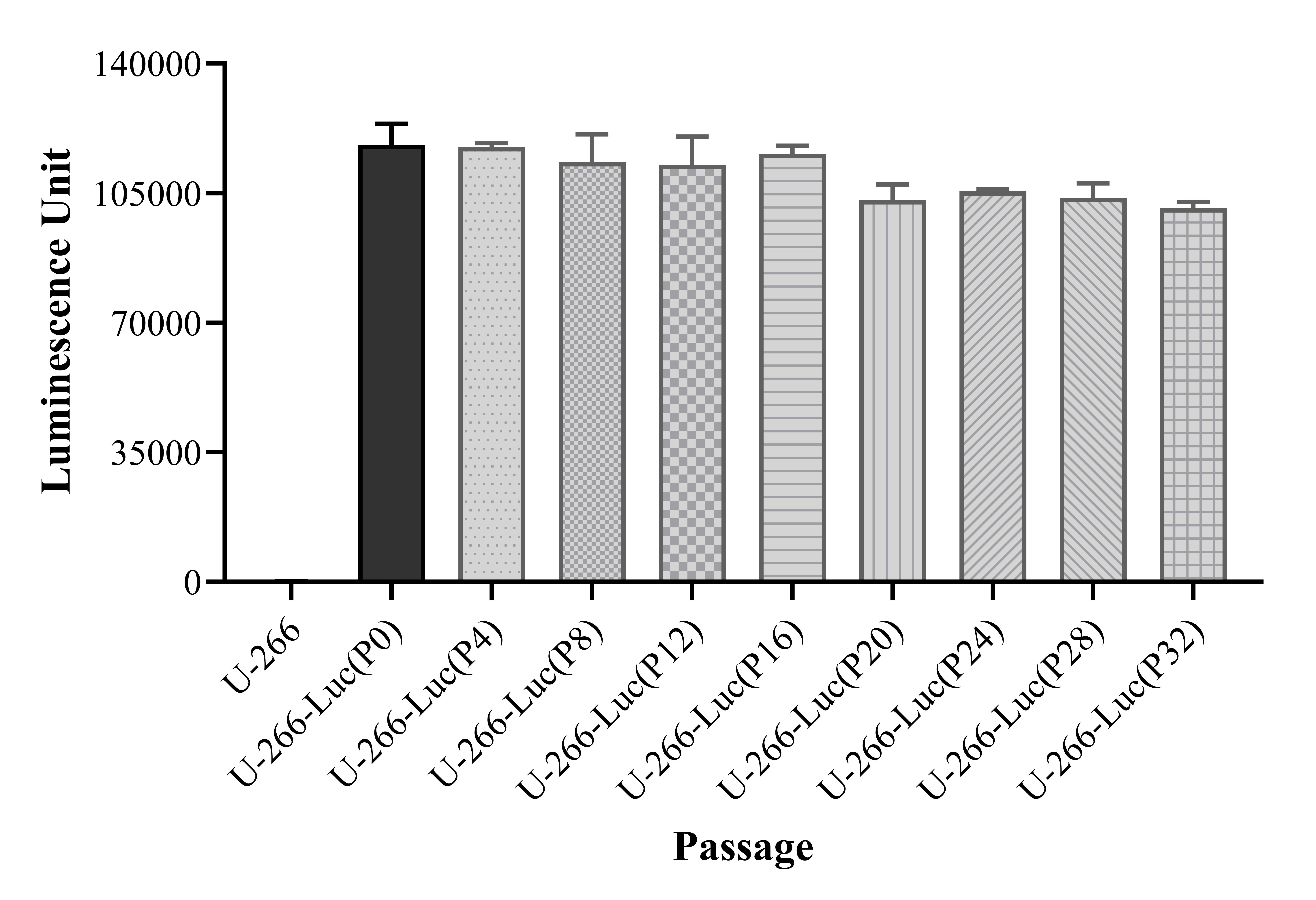 Figure 1. Stablity test results. U-266-Luc showed at least 32 passage stability with similar luminescence unit.