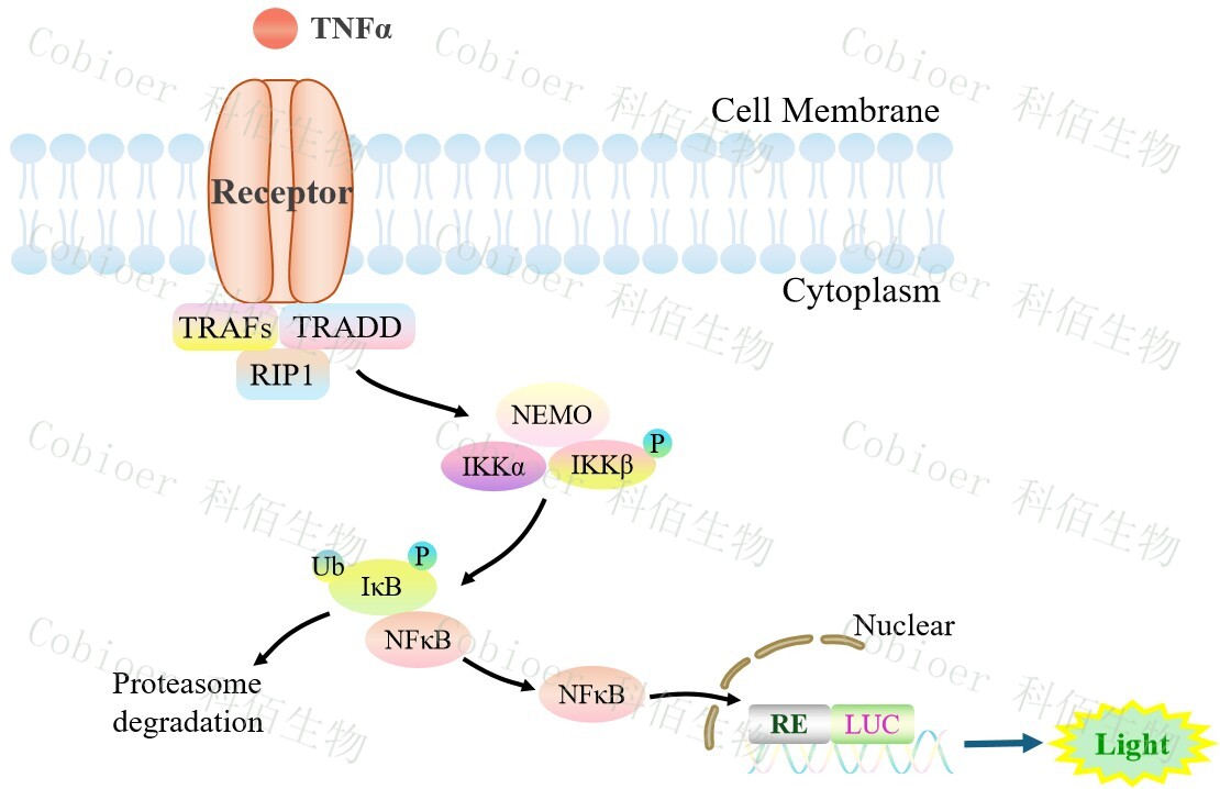 NFκB-Luc K562 報(bào)告基因細(xì)胞,是由 NFκB 調(diào)控并表達(dá) Luc 熒光素酶報(bào) 告基因的 K562 細(xì)胞。TNFα與受體結(jié)合,激活 NF-κB 的原理見(jiàn)下圖所示。