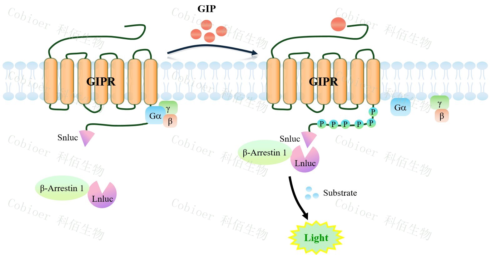 GIPR β-Arrestin 1 CHO 報(bào)告基因藥靶模型很好的模擬了體內(nèi) GIPR/β-Arrestin 1 的信號 轉(zhuǎn)導(dǎo)過程,原理見下圖所示。當(dāng)缺乏配體刺激時(shí),β-Arrestin 1 不與 GIPR 結(jié)合,融合β- Arrestin 1 的熒光素酶處于失活構(gòu)象,當(dāng) GIPR 遭遇配體刺激時(shí),融合熒光素酶報(bào)告基因的 β-Arrestin 1 被招募,使熒光素酶報(bào)告基因處于激活狀態(tài),加入其底物后發(fā)光信號增強(qiáng)。![]() Figure 1. GIPR β-Arrestin 1 CHO 細(xì)胞模型原理圖 |