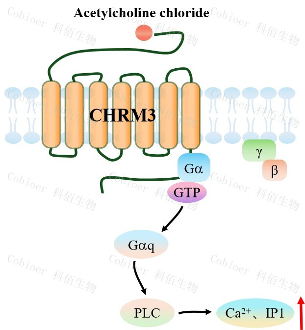 | CHRM3(Cholinergic Receptor Muscarinic 3)是毒蕈堿型乙酰膽堿受體(mAChRs)家 族的重要成員,屬于 GPCR,主要分布于外周組織(如 平滑肌、外分泌腺)及部分中樞區(qū) 域(如下丘腦),通過介導(dǎo)乙酰膽堿(ACh)信號(hào)調(diào)控平滑肌收縮、腺體分泌及能量代謝。 ACh 結(jié)合 CHRM3 后,激活 Gq/11 蛋白,啟動(dòng) PLCβ信號(hào)通路,水解 PIP2 生成 IP3 和 DAG, 觸發(fā)細(xì)胞內(nèi)鈣離子釋放,激活蛋白激酶 C(PKC);通過β-arrestin 通路調(diào)控 ERK 磷酸化, 影響細(xì)胞增殖與炎癥反應(yīng)。 | |