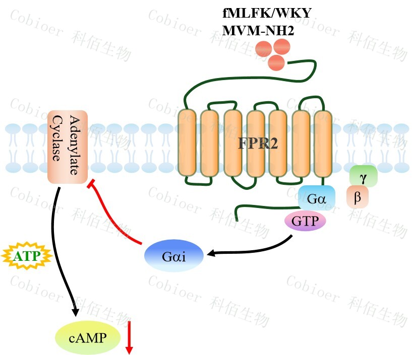 cAMP 在 G 蛋白偶聯(lián)受體(GPCR)信號(hào)轉(zhuǎn)導(dǎo)中是一種關(guān)鍵的第二信使。當(dāng)配體結(jié)合 到 GPCR,構(gòu)象發(fā)生變化,激活受體接著激活 G 蛋白,Gi 的激活導(dǎo)致腺苷酸環(huán)化酶調(diào)控 cAMP 的下調(diào)。FPR2 CHO 藥靶模型很好的模擬了體內(nèi) FPR2 的信號(hào)轉(zhuǎn)導(dǎo)過(guò)程,原理見(jiàn)下圖 所示。