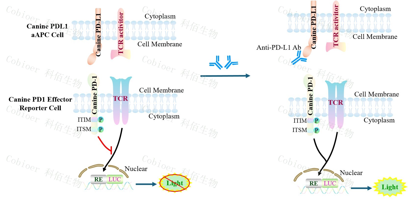 Canine PDL1 aAPC Cell 作為 Canine PD1 Effector Reporter Cell 的靶細胞,Canine PDL1 aAPC Cell 藥靶模型很好的模擬了體內(nèi) PD1&PDL1 的信號轉(zhuǎn)導(dǎo)過程,原理見下圖所示。