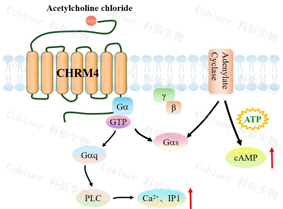 毒蕈堿乙酰膽堿受體(MAChRs,簡稱 M 受體)參與中樞神經(jīng)系統(tǒng)的運(yùn)動控制、體溫 調(diào)節(jié)、心血管調(diào)節(jié)和記憶,介導(dǎo)周圍神經(jīng)系統(tǒng)的平滑肌收縮、腺體分泌和心率、調(diào)節(jié)心肌 收縮力。CHRM4 作為 Gi/o 偶聯(lián)型毒蕈堿受體,中樞神經(jīng)系統(tǒng)高表達(dá),其內(nèi)源性配體乙酰 膽堿(ACh)激活后優(yōu)先通過 Gi/oα亞基抑制腺苷酸環(huán)化酶,同時釋放 Gβγ二聚體。