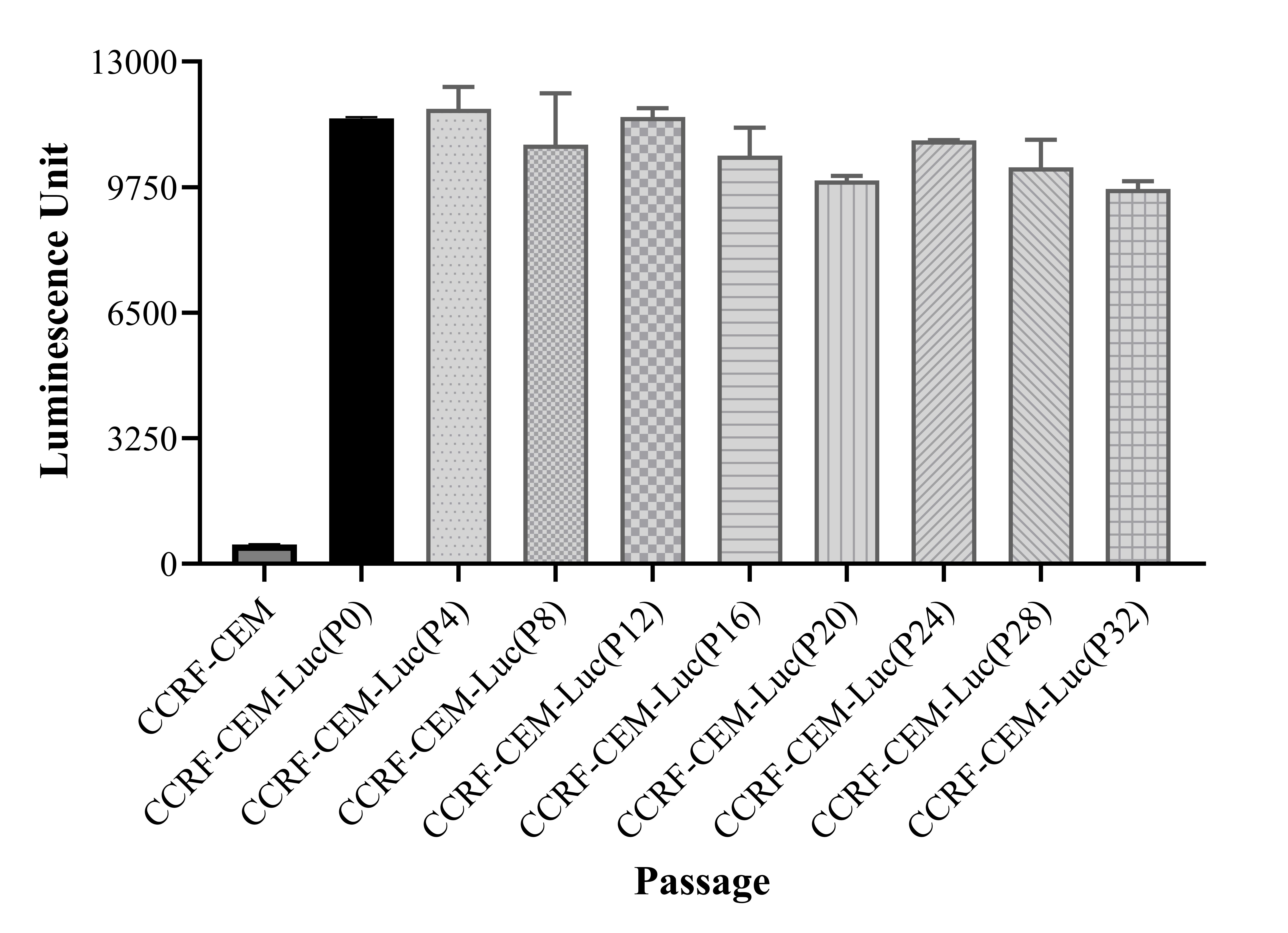 Figure 1. Stablity test results. CCRF-CEM-Luc showed at least 32 passage stability with similar luminescence unit. |