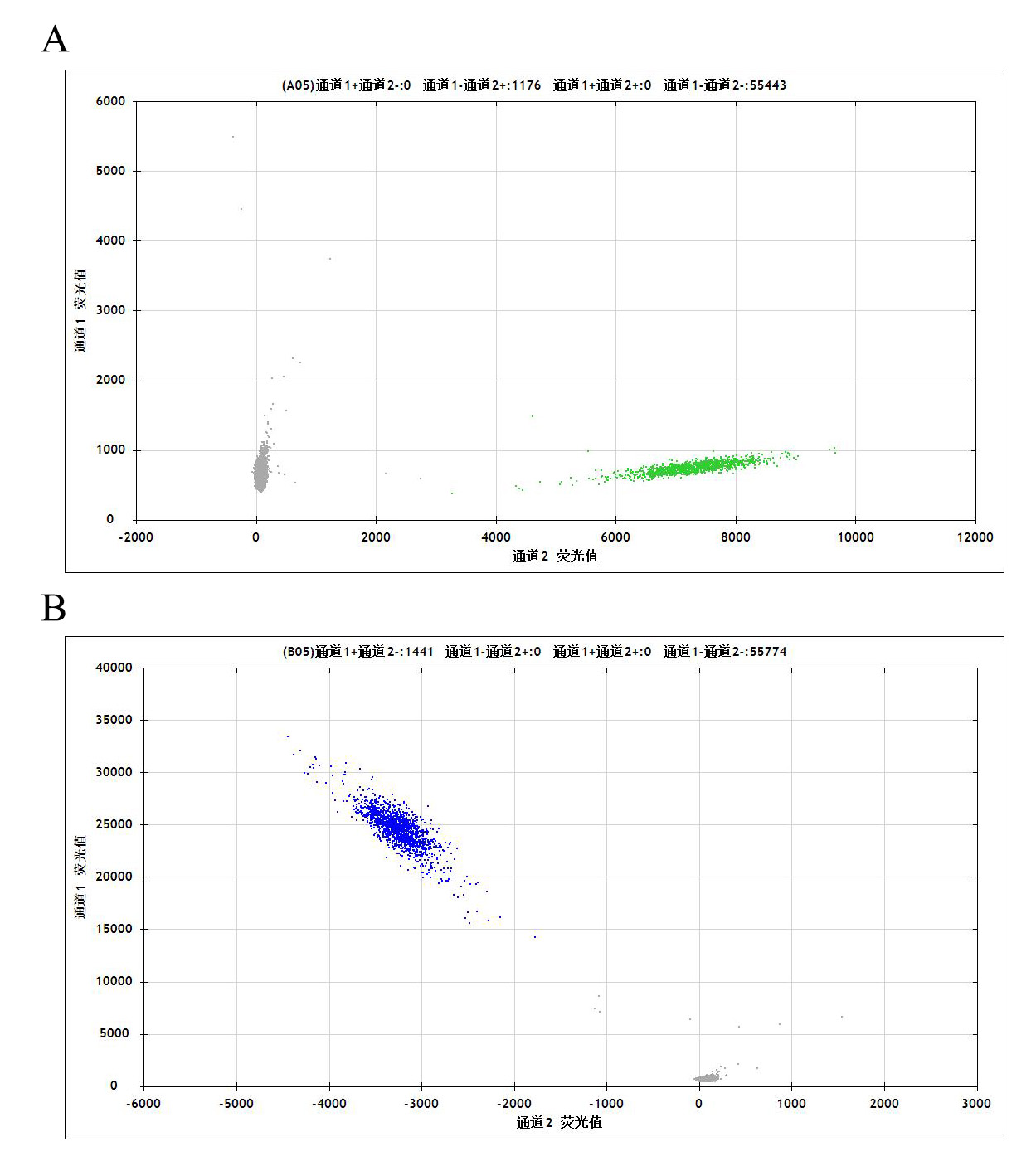 Figure 1. A: MCF7 Parental Cell;B:ESR1[E380Q] (Homozygous,AF%:100) Isogenic MCF7     通道2 藍色微滴代表ESR1[E380Q]突變陽性,通道2 綠色微滴代表該位點為陰性野生型